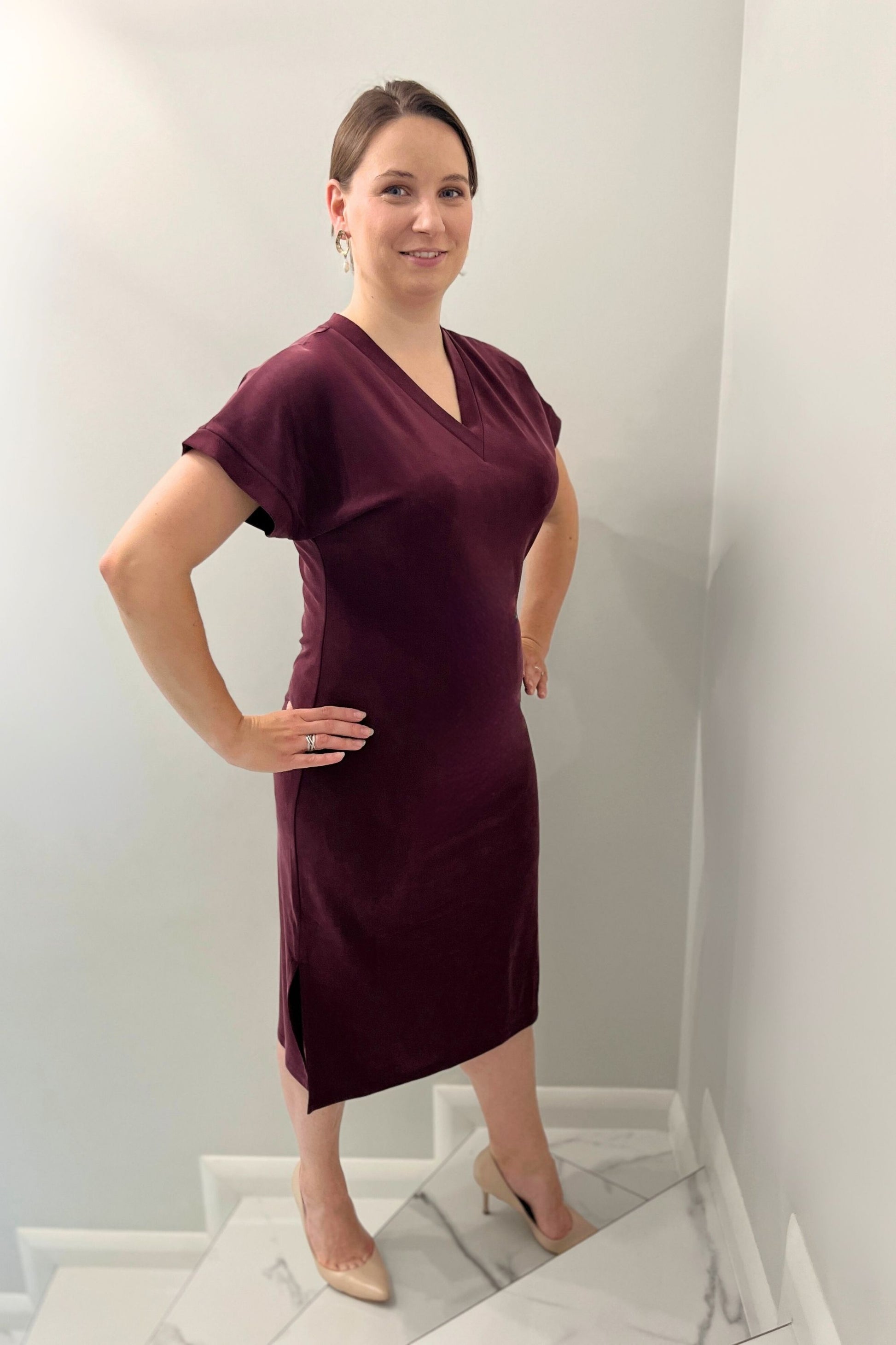 Jej V-dekolt wysmukla szyję i podkreśla linię obojczyków, a dwa rozporki po bokach dodają lekkości i swobody ruchu. To właśnie te detale sprawiają, że jest tak wyjątkowa – kobieca, ale nie oczywista. Rękawy delikatnie opadające,subtelnie otulają ramiona, dodając sylwetce lekkości.